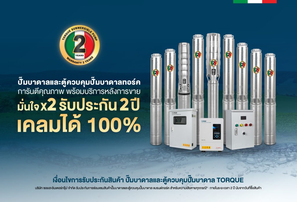 เมื่อมีการรับประกันที่ครอบคลุมถึง 2 ปี คุณจึงมั่นใจได้ว่าการลงทุนซื้อ ปั๊มบาดาล TORQUE คือการลงทุนที่คุ้มค่าที่สุด