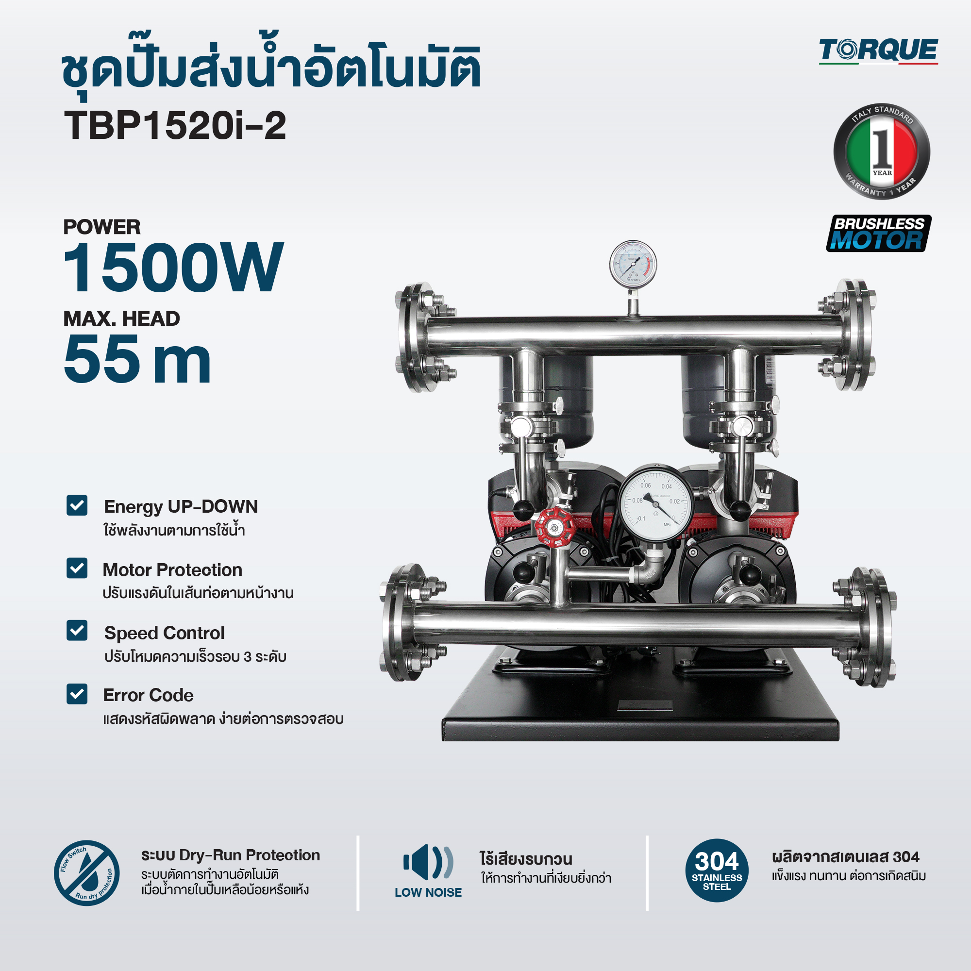 TORQUE TBP1520i-2 ชุดปั๊มส่งน้ำแรงดันสูงแบบอัตโนมัติ มาพร้อมระบบควบคุมแรงดันอัจฉริยะ เหมาะสำหรับใช้งานในอาคาร บ้านพัก โรงงาน หรือระบบส่งน้ำที่ต้องการแรงดันคงที่