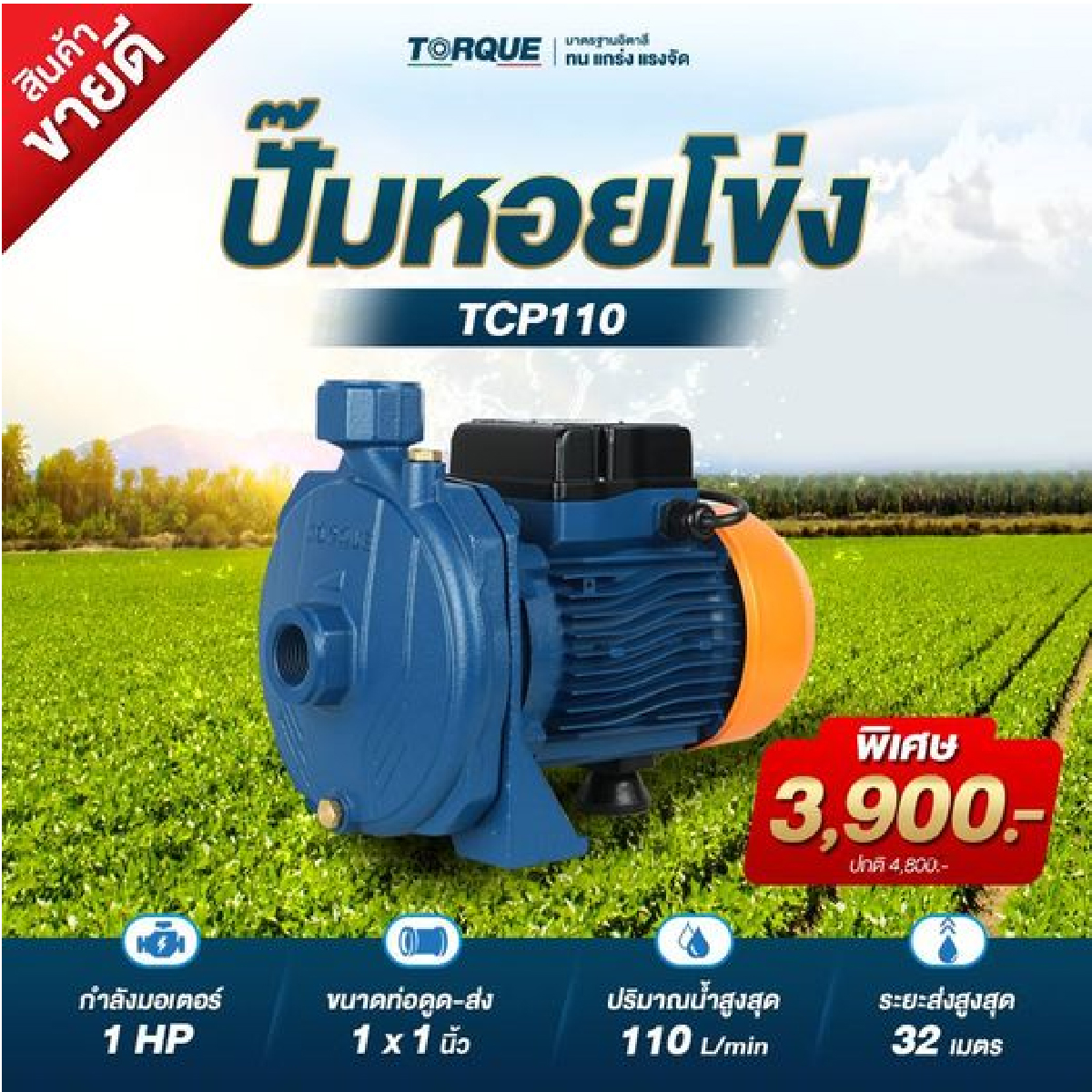 TORQUE รุ่น TQ-TCP110 ปั๊มหอยโข่งไฟฟ้าใบพัดเดี่ยวแบบปิด (Close Impeller) ออกแบบเพื่อการใช้งานที่ต้องการแรงดันสูงและการไหลของน้ำต่อเนื่อง เหมาะสำหรับงานสูบน้ำในภาคเกษตรกรรม อาคาร บ้านพัก หรือระบบส่งน้ำทั่วไป ตัวเครื่องผลิตจากวัสดุคุณภาพสูง แข็งแรง ทนต่อการกัดกร่อน และช่วยให้การทำงานมีประสิทธิภาพสูงสุด